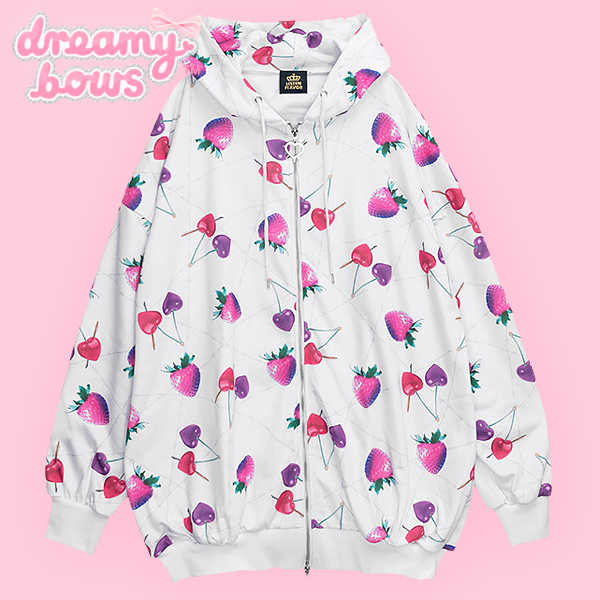 This unique oversize zip-up hoodie by Listen Flavor is the perfect outer layer for anyone with a cute alternative style~ Featuring an all over print of strawberries and heart shaped cherries with barbed wire background, this hoodie can be dressed up or down and can suit a number of styles like Pastel Goth or Yami Kawaii. The material is soft and the 2-way loop zip means you can wear it done up at the neck or the hip.